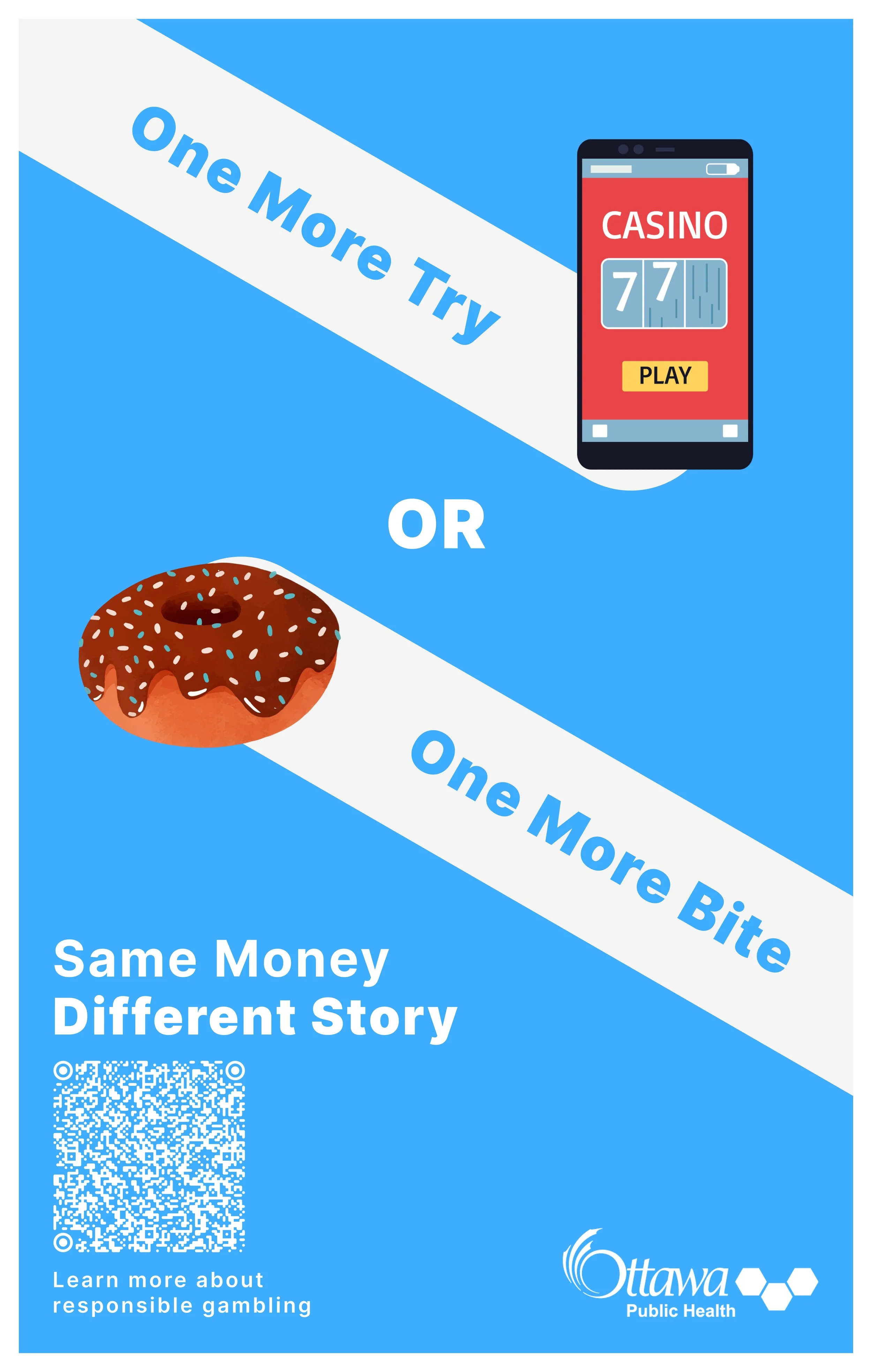 “Same money, different story” is a campaign project focused on early signs of problem gambling among young professionals in Ottawa. We designed a layered experience that connects physical and digital touch-points. Posters and digital ads are the first point of contact. They use simple comparisons to show the difference between gambling and everyday local experiences. The website continues this idea by